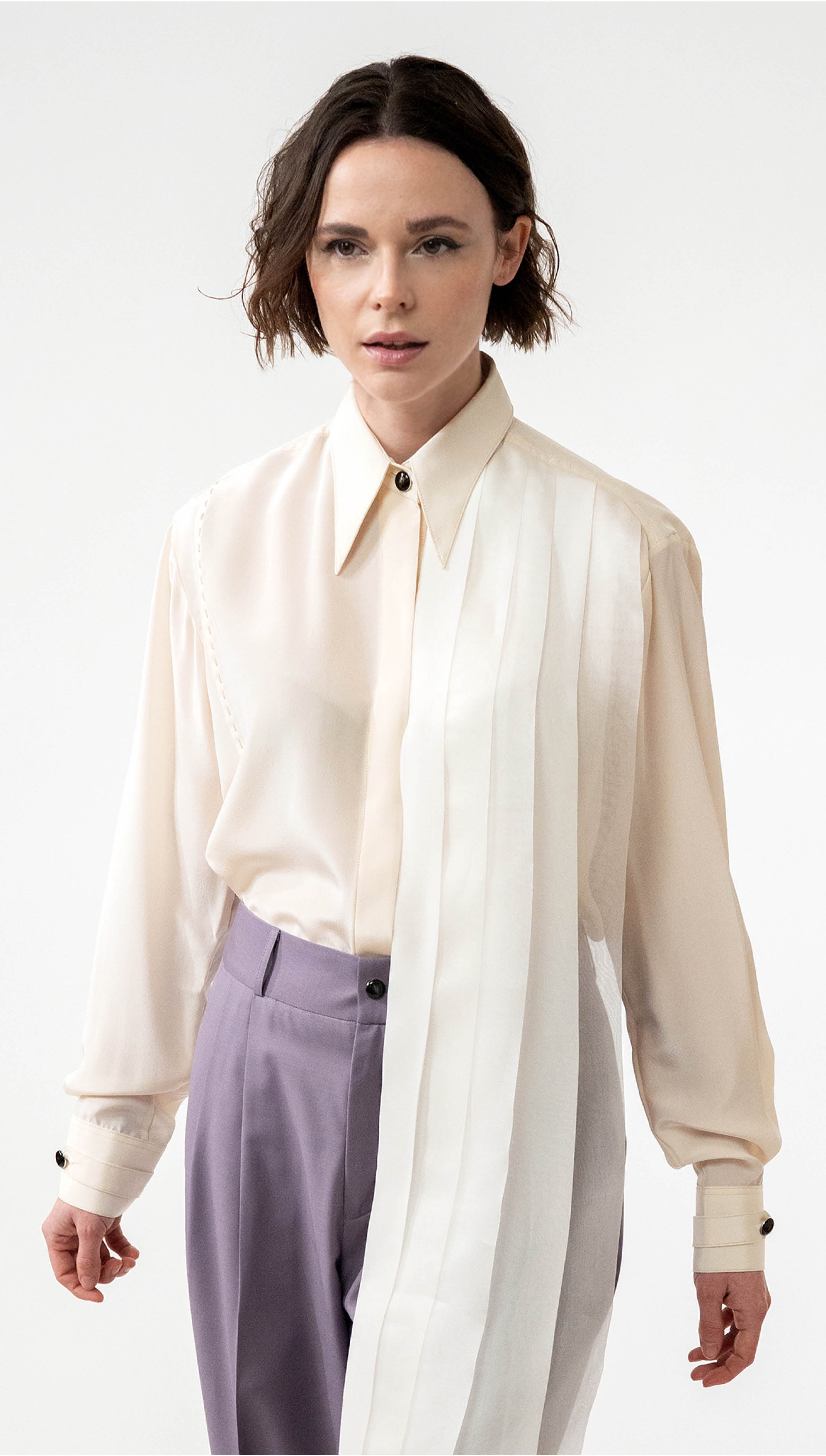 • Elevate your everyday look with this shirt made in crepe silk with delicate pleats in organza and chiffon silk