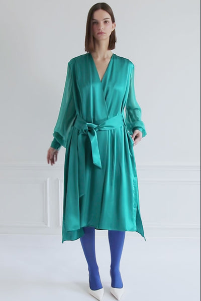 A wardrobe essential, our SAN FRANCISCO fresh green silk flowing dress is crafted from satin silk with chiffon silk on the sleeves. This piece offers a graceful drape and a naturally comfortable allure.